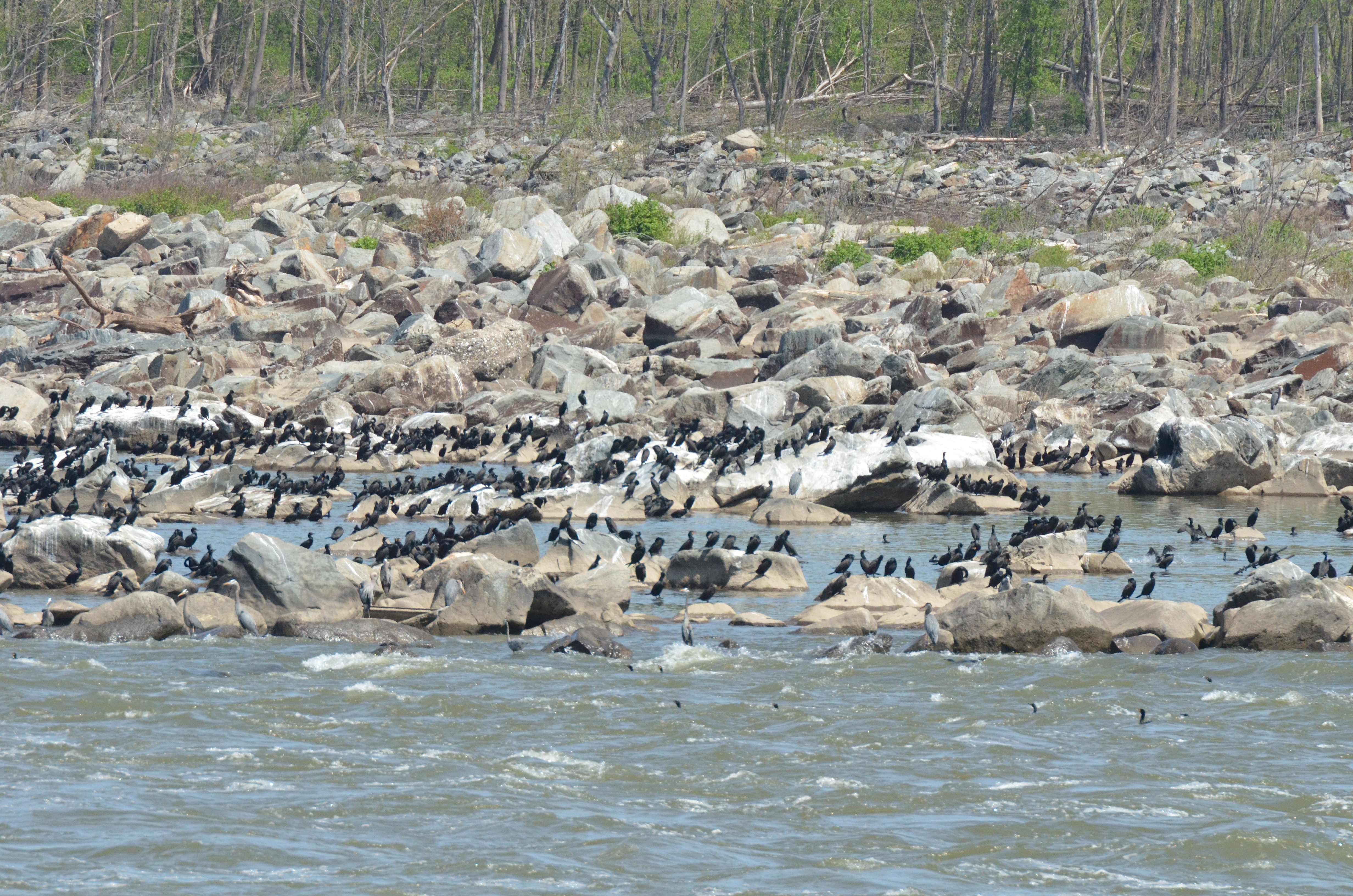 Did I say “in great numbers?” Just survey a portion of the gathering (click to enlarge). The cormorants are the black birds and the most numerous. Harder to see are the ones fishing in the rushing water. Unlike ducks, the feathers or cormorants are not buoyant, so they sink down in the water instead of riding up on top of it. The reason their feathers don’t float is so they can dive down for food, which most ducks can’t do. Cormorants can dive down very deep after food, although fishing is so good below Conowingo that they likely get plenty to eat not far beneath the surface.