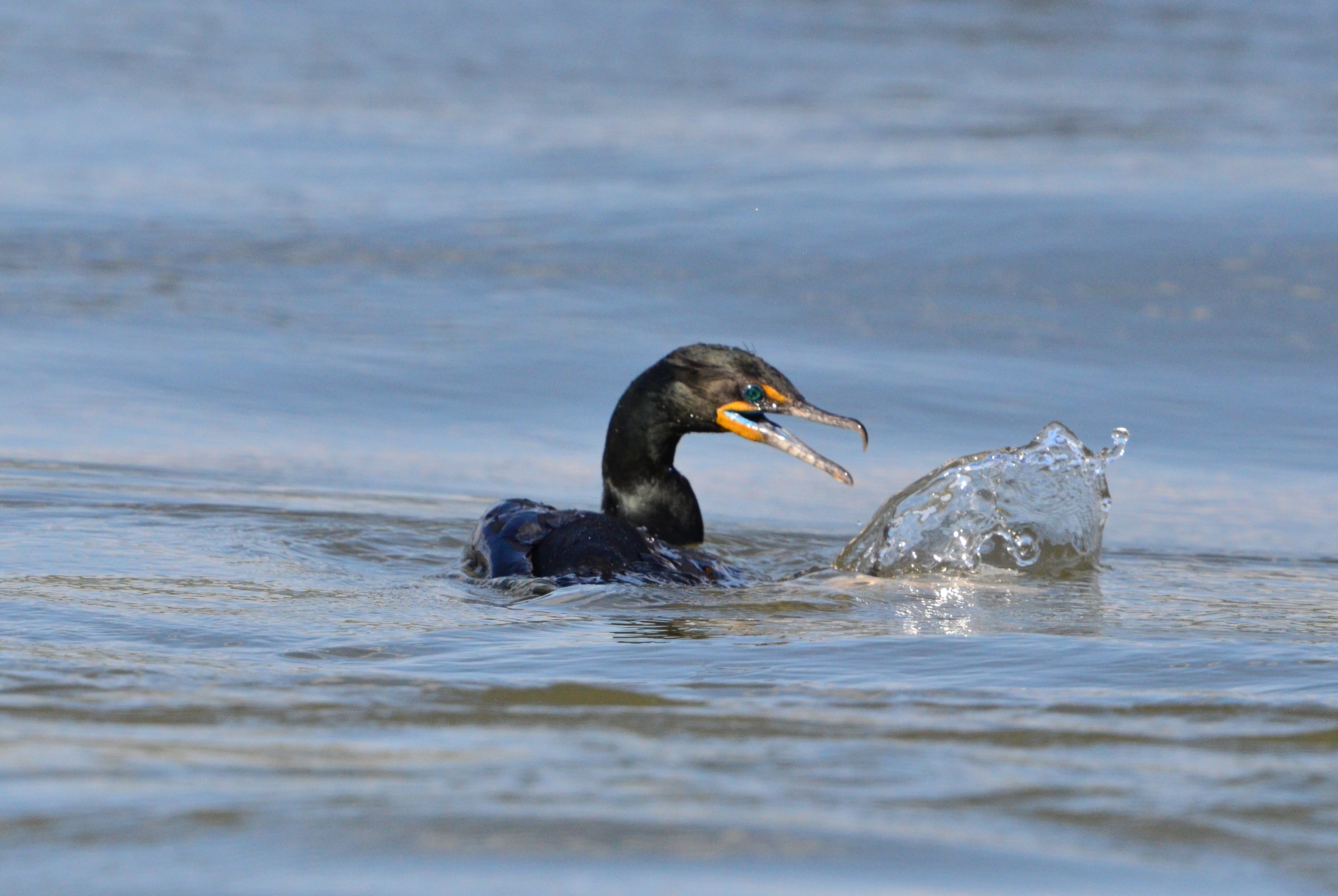 There are 40 some varieties of cormorants. These are the most common in our area — the double-crested cormorant, so named because the male sports a second crest during the mating season. As shown here, the birds have a fearsome weapon for snagging fish. Not only are their beaks long and needle sharp, the top part has a wicked hook in the shape of, well, a fish hook. Imagine being a fish and having that thing come toward you at lightening speed. And this only moments after you got churned through the massive turbines of Conowingo dam.