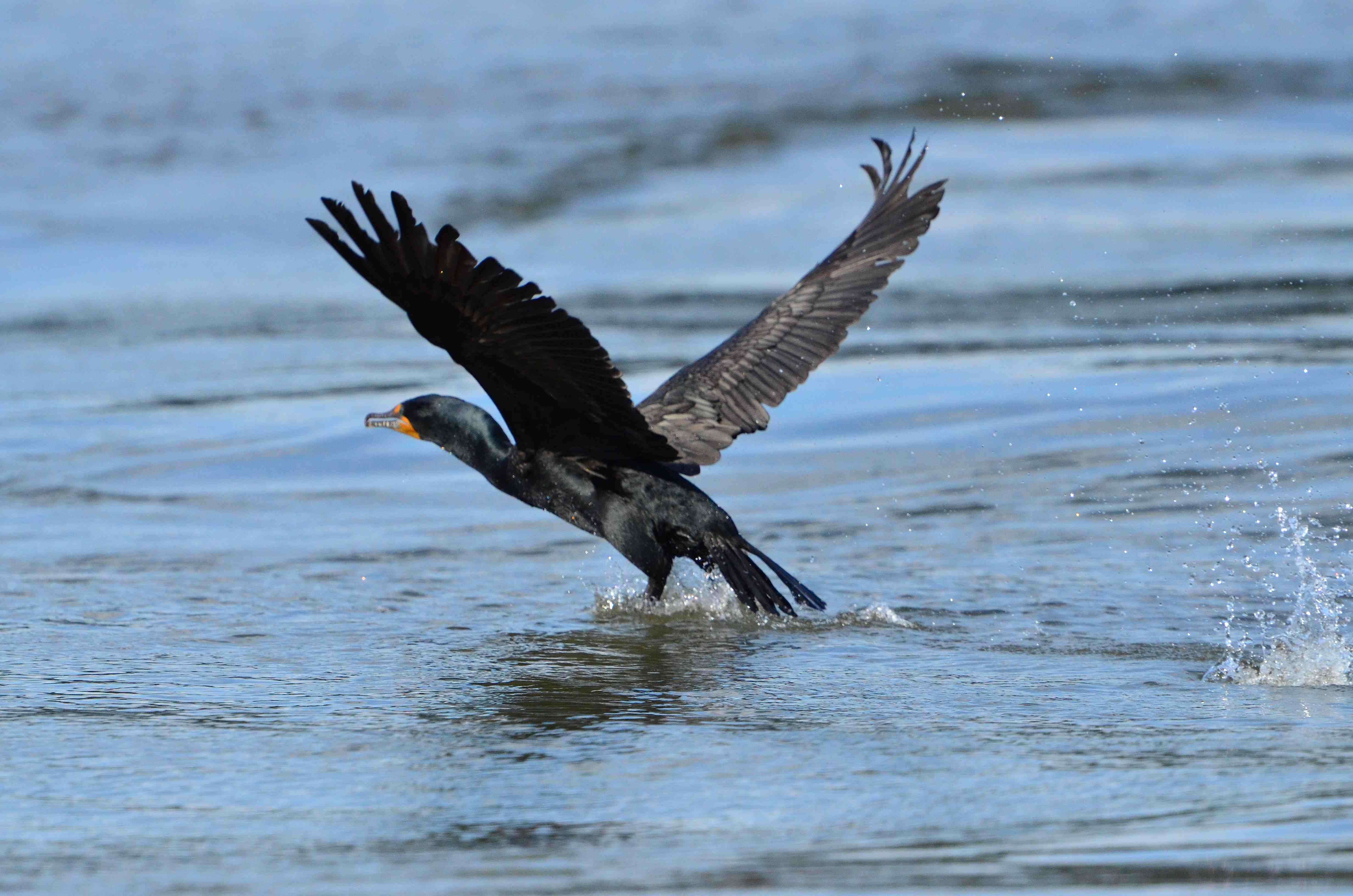 Since the feathers of cormorants get wet and heavy, the birds have a struggle to get airborne during a water takeoff. Their wings have to work really hard and also their webbed feet need to help out as well. It takes a good distance and creates a lot of fuss. A feeding cormorant may have to perform these takeoffs numerous times before catching a fish. They fly up close to the dam and land, then float downsteam watching for their next meal. If they don’t find it by a certain point downstream, they takeoff and land upstream again.