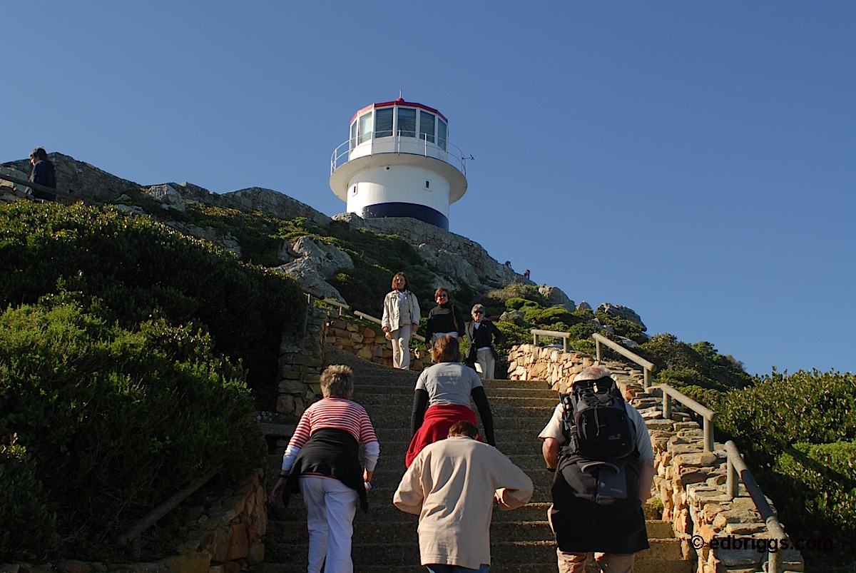 The Cape of Good Hope is an easy day trip from Cape Town and the one and only route down along False Bay is interesting as well. This area is famous for Great White Sharks and I observed parties who were going out to mix and mingle. Also along this coast near Simons Town is Boulders Beach and its colony of African Penguins. Be sure to see my lucky shot of a “performing penguin” and the shadows of fellow watchers and photographers looking down on it. Also notice on the shot of the baboon who was sitting on the roof of someone’s car the “deposit” he was leaving on the trunk lid. The baboons are so numerous around the Cape of Good Hope parking lot that there are uniformed attendants roaming with sticks to keep order. The animals are aggressive toward people with food to be had. I saw one chase a woman and her ice cream cone across the lot. The cone and the woman were soon parted, and the baboon headed off with its prize.