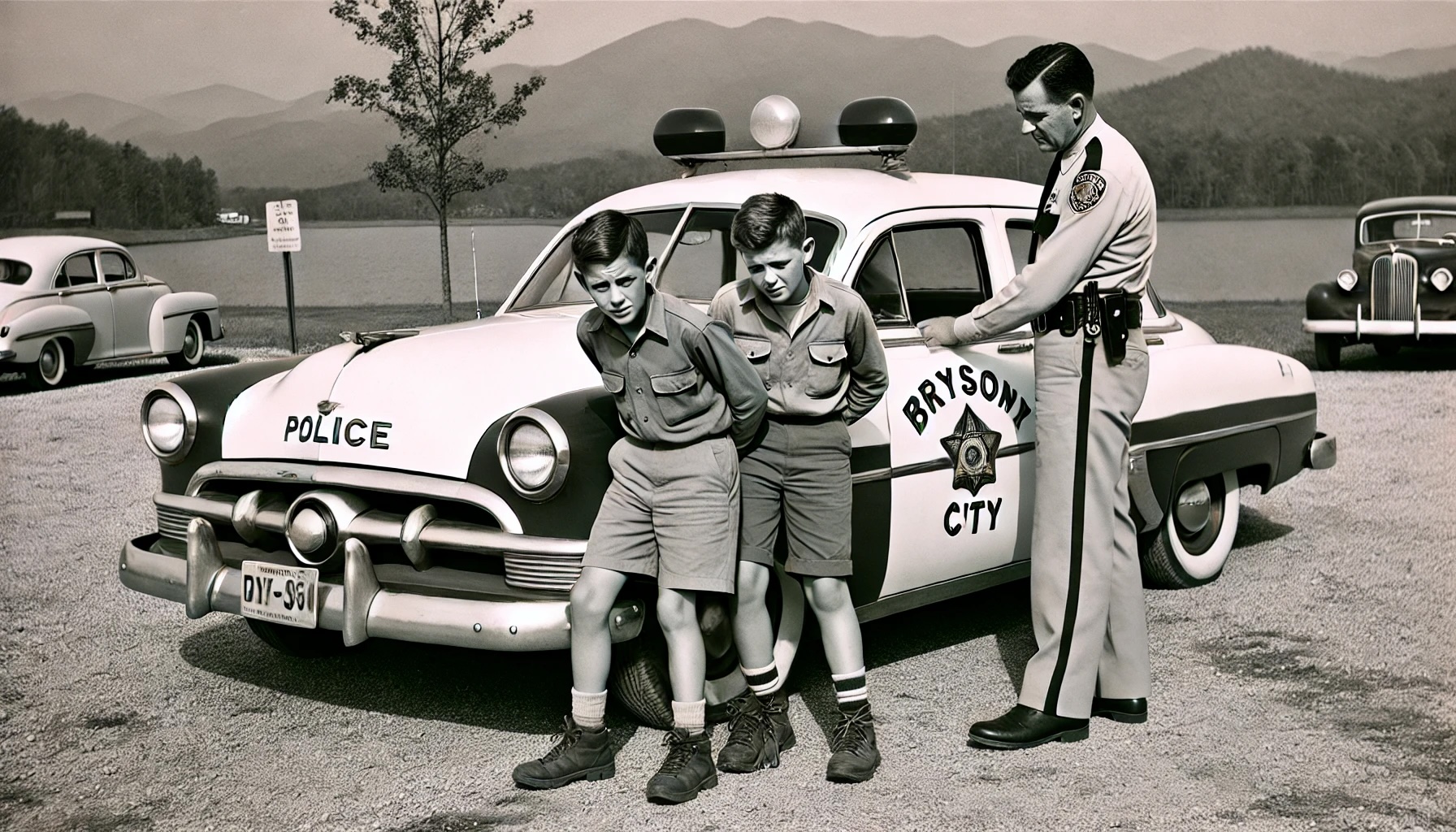 I now think that Murphy had talked with the called policeman before we arrived back with the mountain man. Murphy who was mortified, but still our friend and leader. The Bryson City policeman drove out of the parking lot with us in his back seat. He drove around for awhile and talked with us about what we had done, almost like a Murphy himself. Before he brought us back, he mentioned that the same mountain man who called him had been in his jail before. He knew that man. Then he drove us back and set us free. The mountain man had departed.